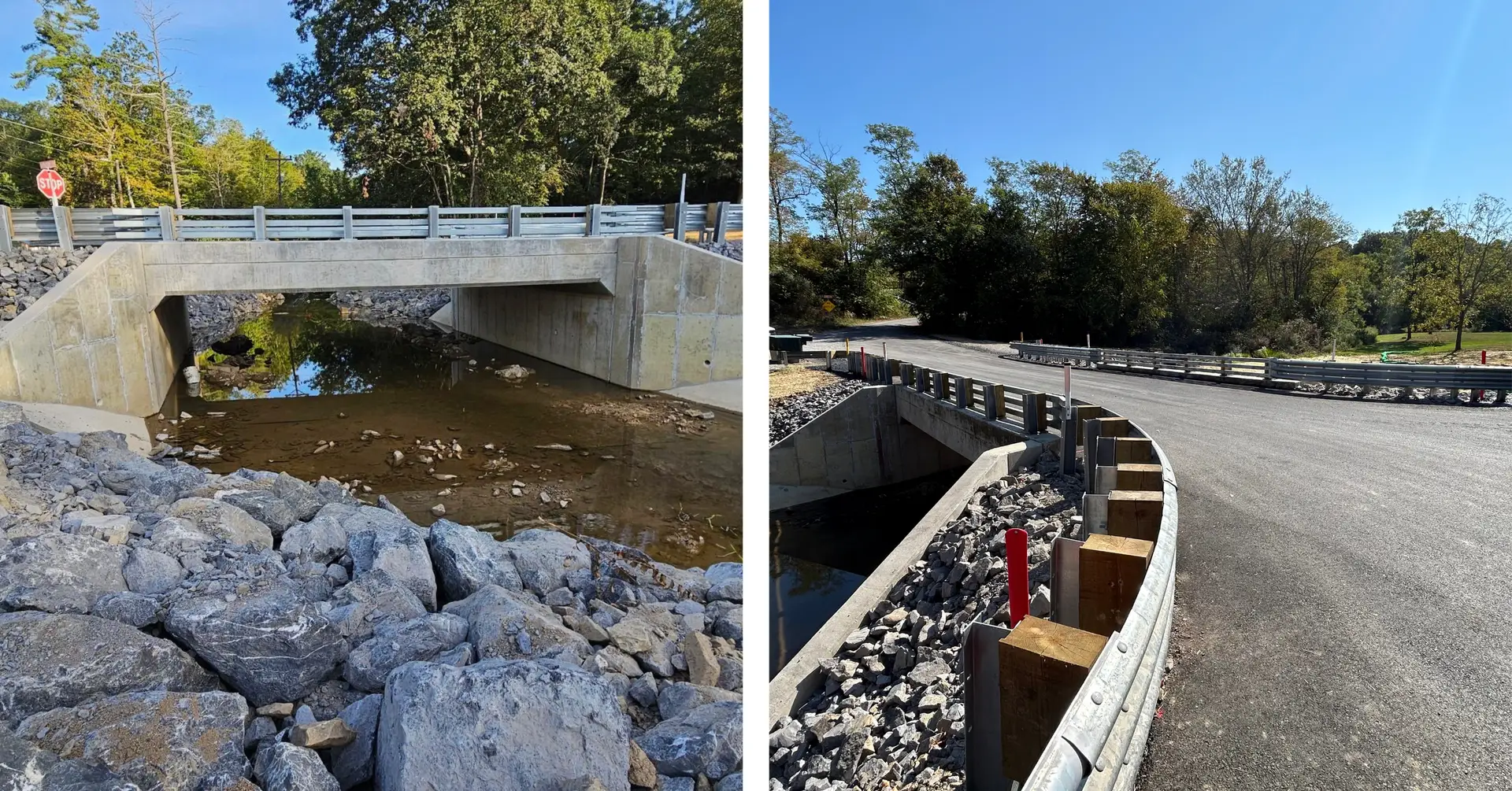 Additional scope included roadway approach construction, installation of protective rock lining within the existing stream channel, and installation of a side-mounted guide rail system.